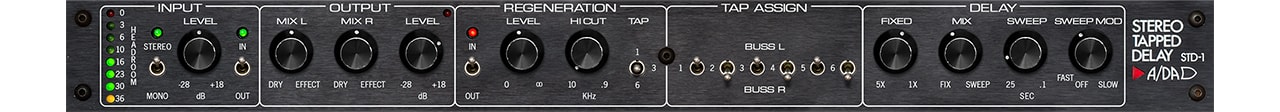 Developed by Brainworx and endorsed by A/DA, the A/DA STD-1 Stereo Tapped Delay plug-in is an exacting emulation of the rare analog rack unit, exclusively for UAD-2 hardware and Apollo interfaces.Add width, depth, and character to any source with a unique analog, bucket-brigade delay circuit