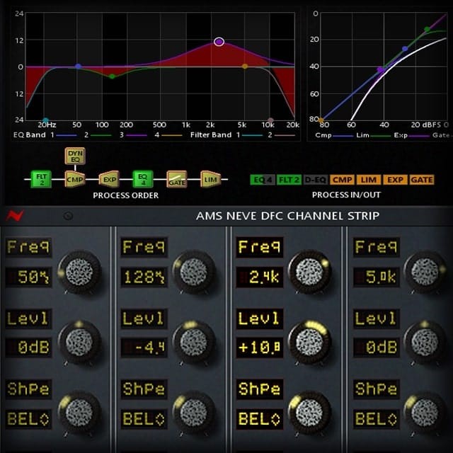 The AMS Neve DFC Channel Strip plug-in includes all 74 of the controls on the DFC console’s channel strip, providing you with the same fast and flexible workflow that post-production engineers have used on over 70% of international blockbusters. And unlike other channel strips, the signal flow of the channel strip’s multiple modules can be reorganized on the fly, with intuitive “drag & drop” rearrangement of processing modules.