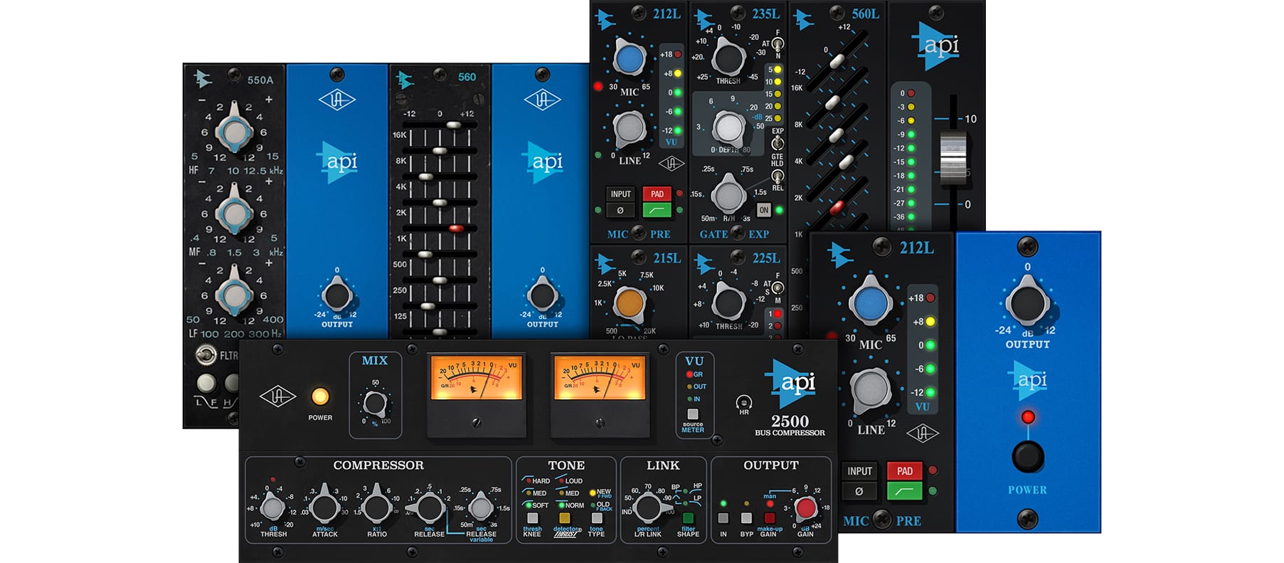 The full suite of API plug-ins, featuring stunning emulations of API's most iconic preamp, compression, EQ, and expander/gate console modules