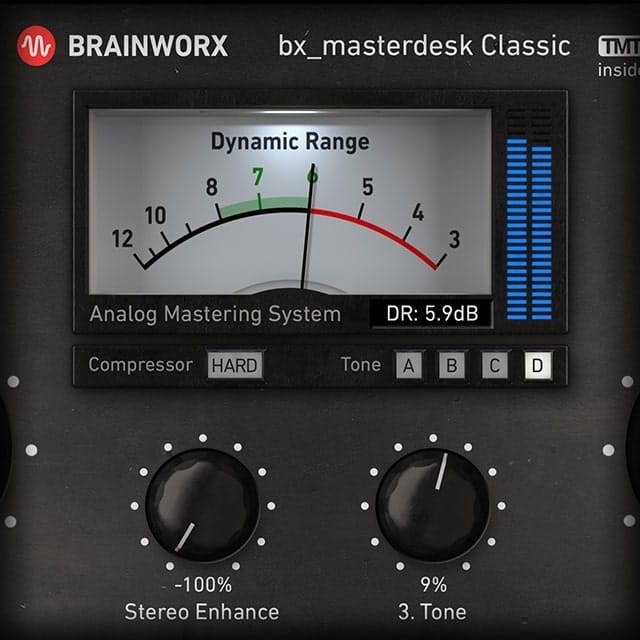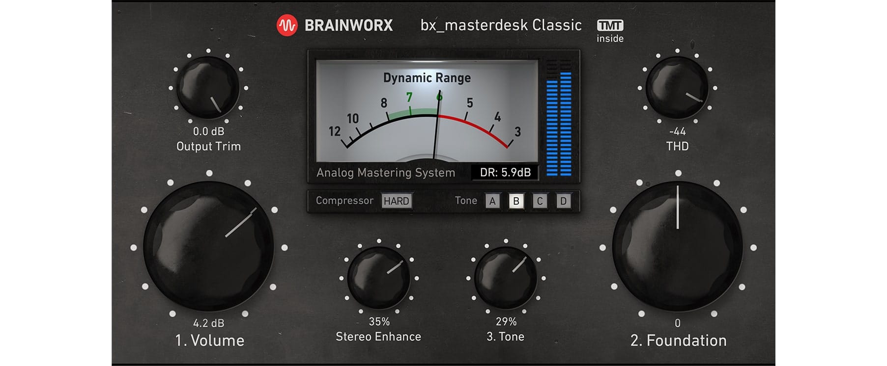 Built on the same high-end analog mastering chain as its big brother, the bx_masterdesk plug-in, the Brainworx bx_masterdesk Classic plug-in offers powerful, easy-to-use controls for a self-contained mastering environment so you can effortlessly produce high‑level masters.Easily master your projects with three simple controls — Volume, Foundation, and Tone
