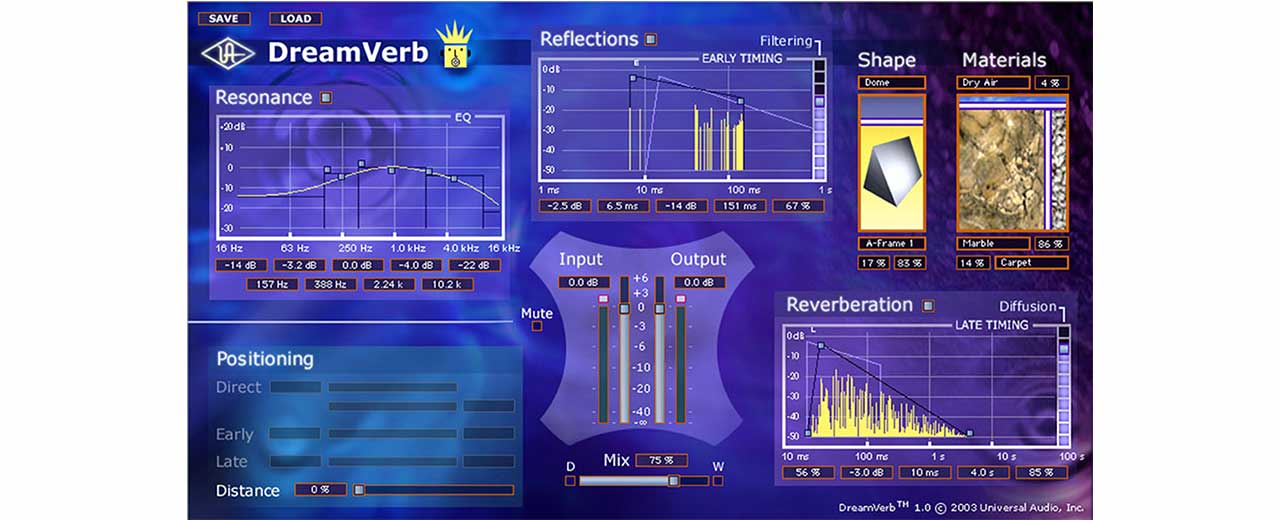 The DreamVerb Room Modeler plug-in for UAD-2 hardware and Apollo interfaces draws on the unparalleled flexibility of UA’s pioneering RealVerb Pro plug-in, and adds an intuitive and powerful interface to help you craft a stunning range of spaces. DreamVerb not only lets you create a room from a huge list of different materials and room shapes. It lets you customize further by blending or "morphing" the different room shapes and surfaces with one another, while the density of the air can be changed to simulate different ambient situations.
