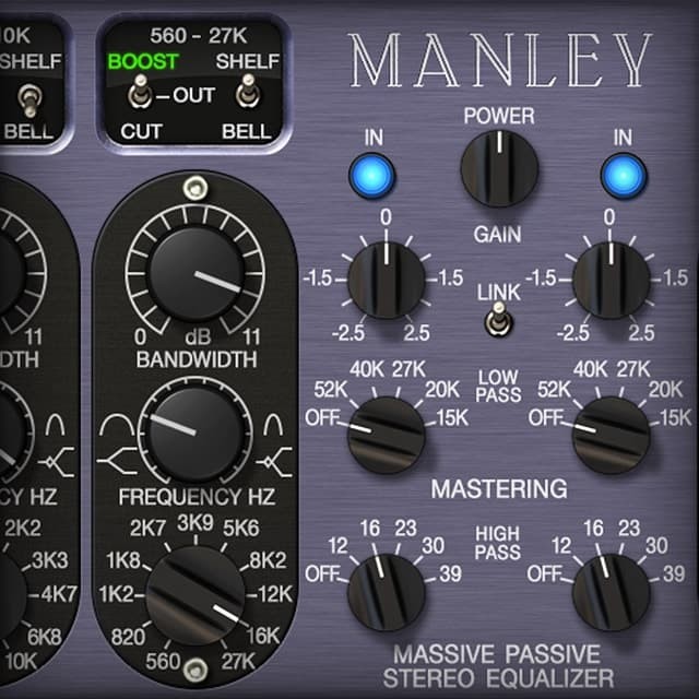 The Manley Massive Passive EQ plug-in gives you a Standard version with continuous bandwidth adjustment, and a Mastering version with 16 steps of easily recallable selections. Perfect for subtle or broad strokes to individual instruments or whole mixes, now you can add presence and sizzle without harshness to drums and vocals, or add weight and heft to an entire mix with clear, punchy bottom end.