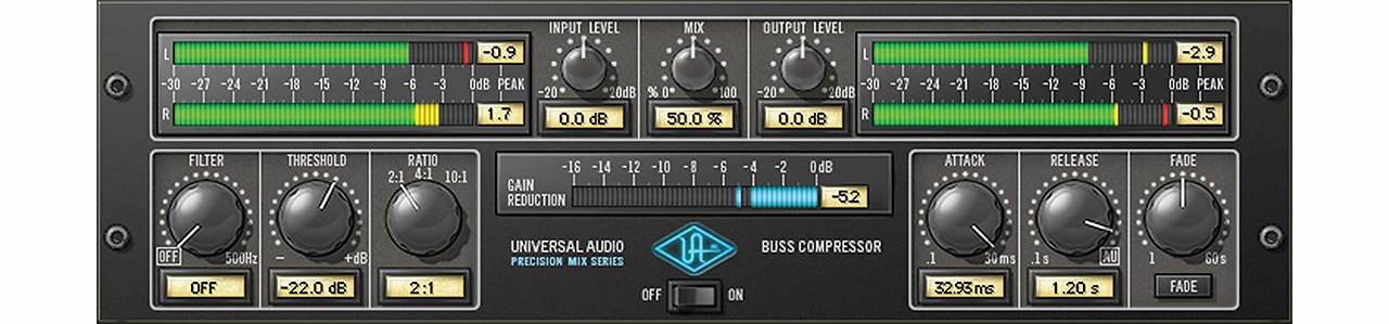 The Precision Buss Compressor is a dual-VCA-type dynamic processor that yields modern, transparent gain reduction characteristics. It is specifically designed to “glue” mix elements together for that cohesive and polished sound typical of master section console compressors.