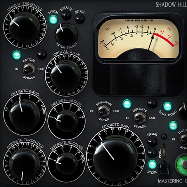The genius of the Shadow Hills Mastering Compressor plug-in is its ability to control dynamics in two stages — an Optical and Discrete (VCA). Both sections can be bypassed, effectively providing three compression sounds (Optical, Discrete, and combined) in a single unit.