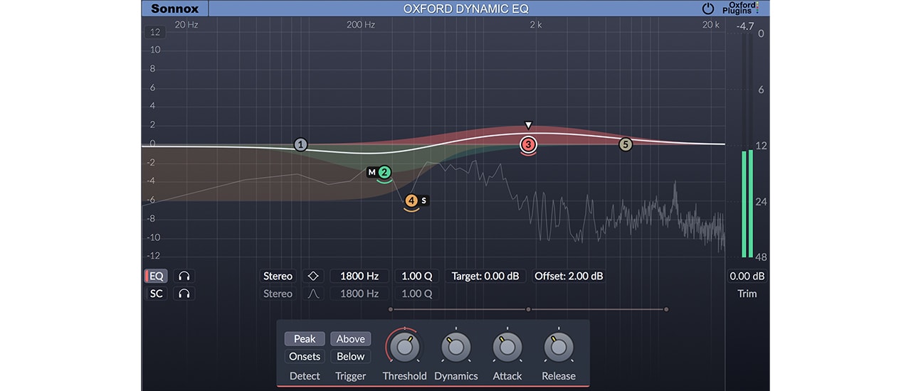 The Oxford Dynamic EQ plug-in’s Onset Detection lets you set the EQ processing to be triggered by transients. This provides you with a new level of precision for boosting or cutting percussive sources and even for controlling vocal sibilance.