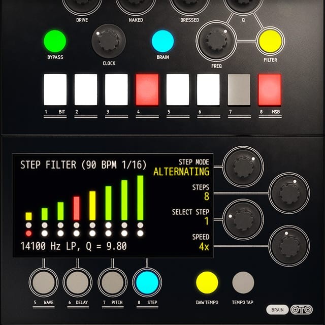 Brain-mode features 4 different lo-fi effects: Waveshaper, Delay, Pitch-Shifting and Step-Filter sequencer